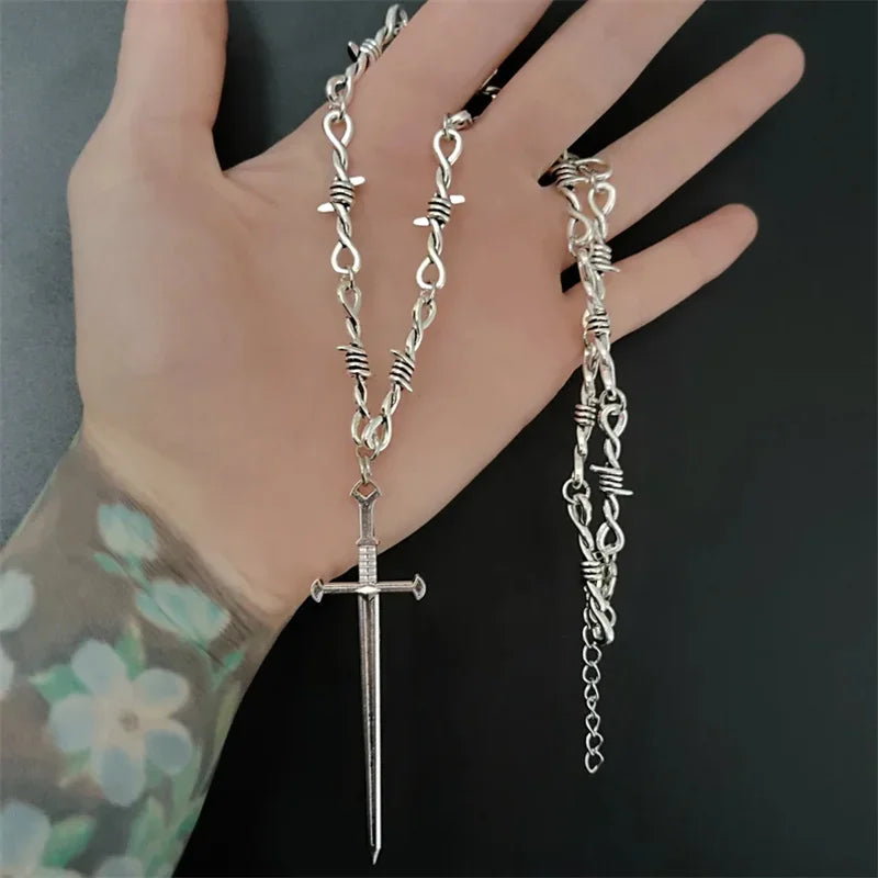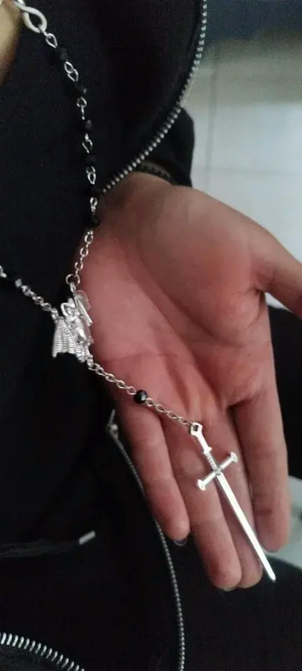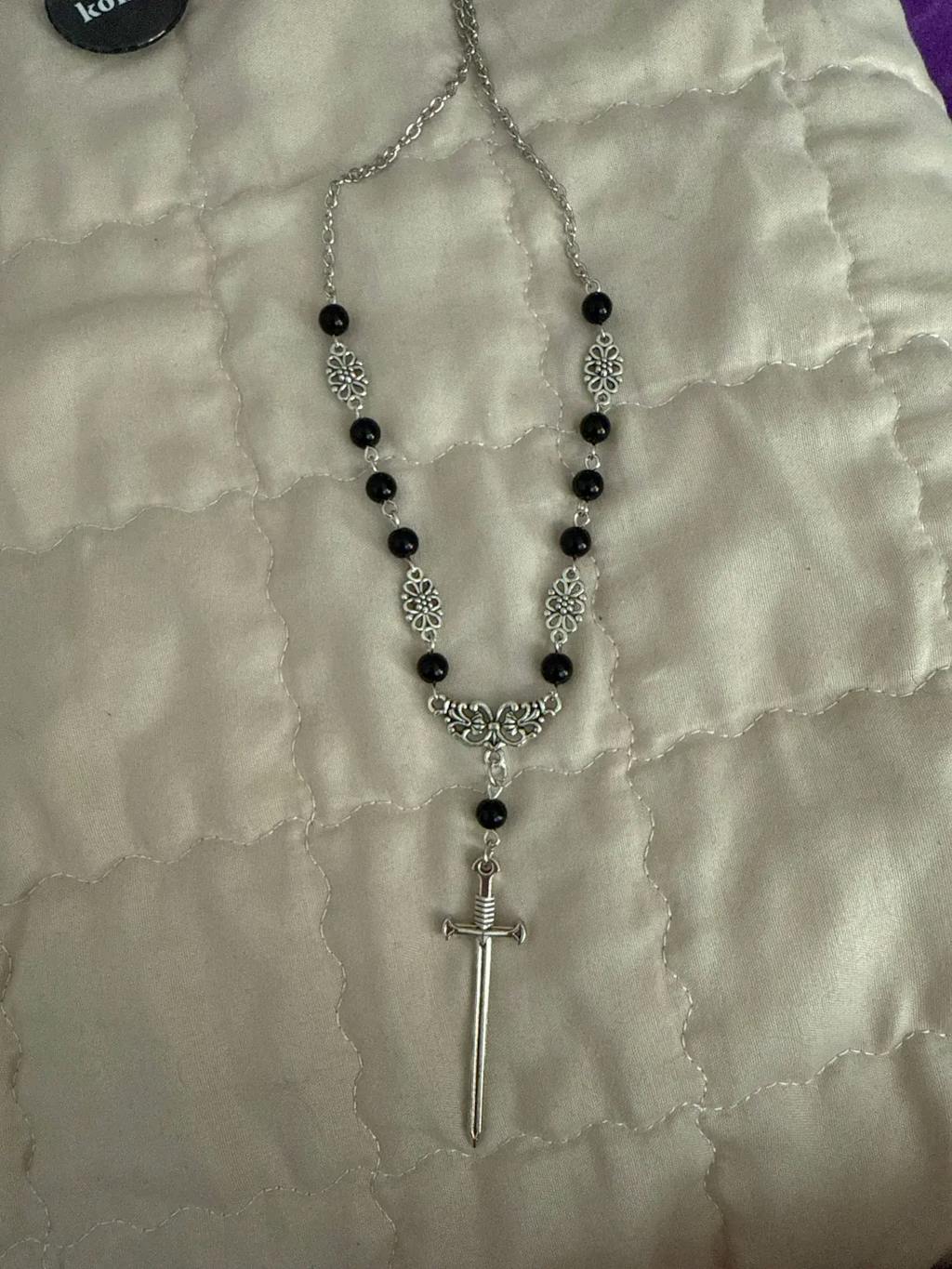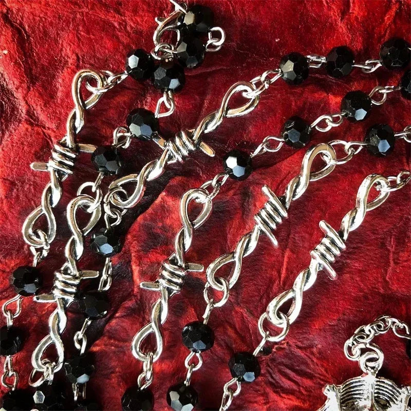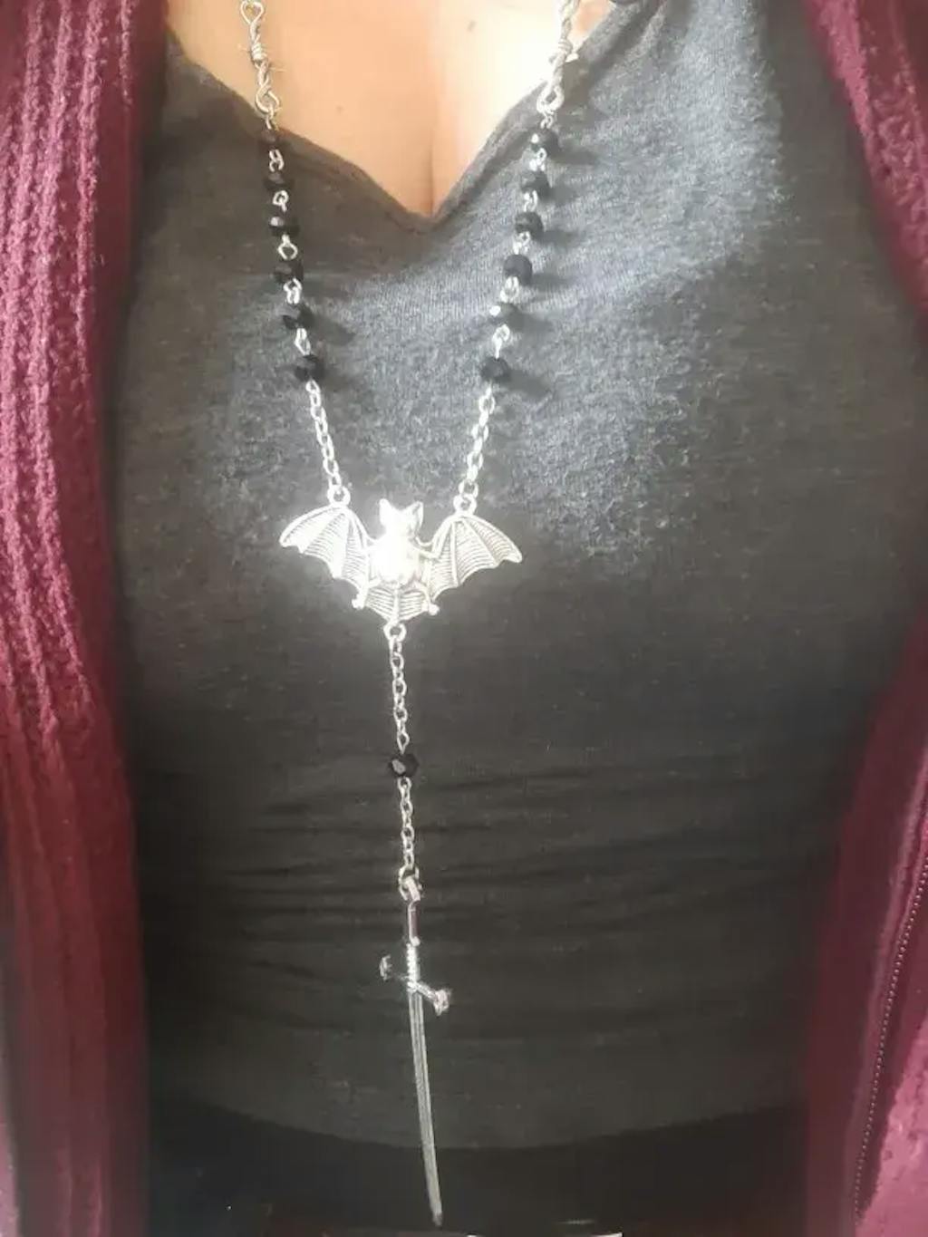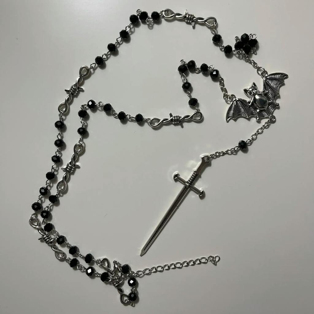Embrace dark magic and mystique with this Gothic Occult Witchy Rosary Necklace, featuring tarot sword and bat charms, delicate little thorns, and beaded details. Perfect for Y2K, Wiccan, vampire, and Halloween cosplay styles.