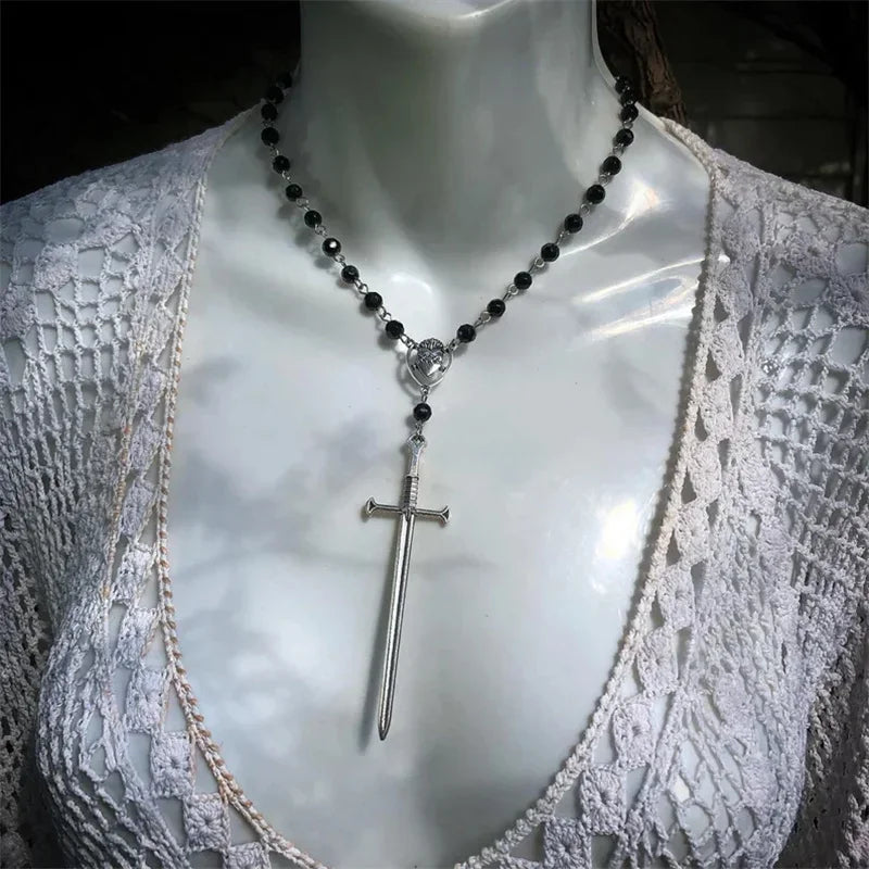Gothic Occult Witchy Rosary Necklace – Tarot Sword Y2K Bat Beaded Wiccan Magic Jewelry